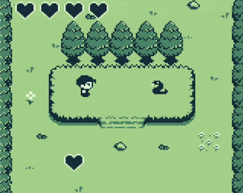 Press Start, interact with the snake to get damaged and see the HP Heart deplete. Go around the area and get damaged by environmental hazards. Interact with the Heart sprite to heal.